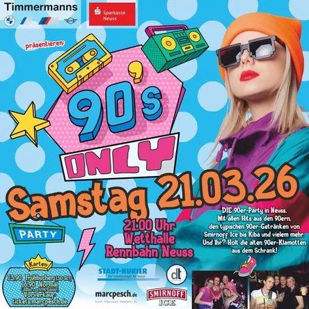 Nach den legendären "90s only"-Partys in den letzten Jahren in der „Alten Wetthalle“ und dem „Zeughaus“ kehren wir am Samstag, den 21. März 2026 zurück in die renovierte und umgebaute Wetthalle. 20 Mal in Folge war diese Veranstaltung in Düsseldorf, Neuss, Dormagen, Ratingen und Grevenbroich restlos ausverkauft.